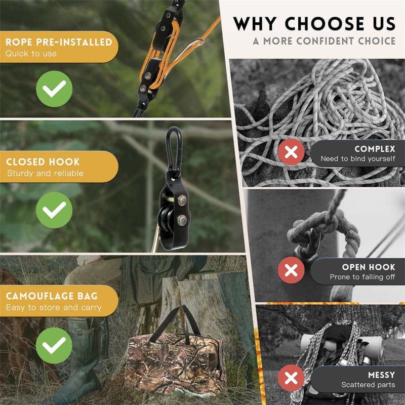 A pre-installed 40ft high-visibility rope eliminates setup time, and all components store neatly inside the camouflage carry bag for quick transport and deployment. Compact, strong, and efficient, this hoist kit makes field dressing and cleaning faster and safer—perfect for hunters who demand reliability and convenience.