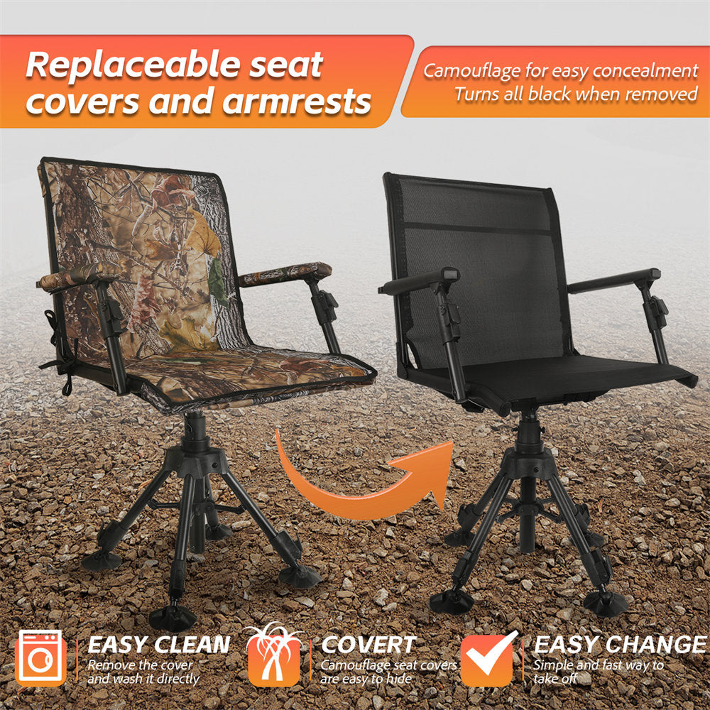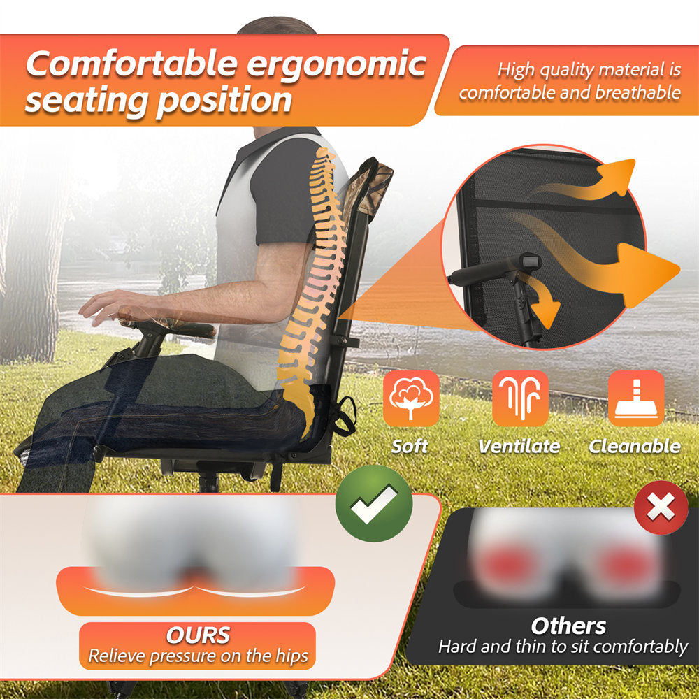 For stealth, the chair includes removable camouflage covers, crafted for deer and turkey habitats. These machine-washable covers can be swapped between woodland patterns and black for versatile concealment. Lightweight yet sturdy, the Ranger360 is the ultimate hunting chair for blinds, stands, and campsites—where silence and comfort matter most.