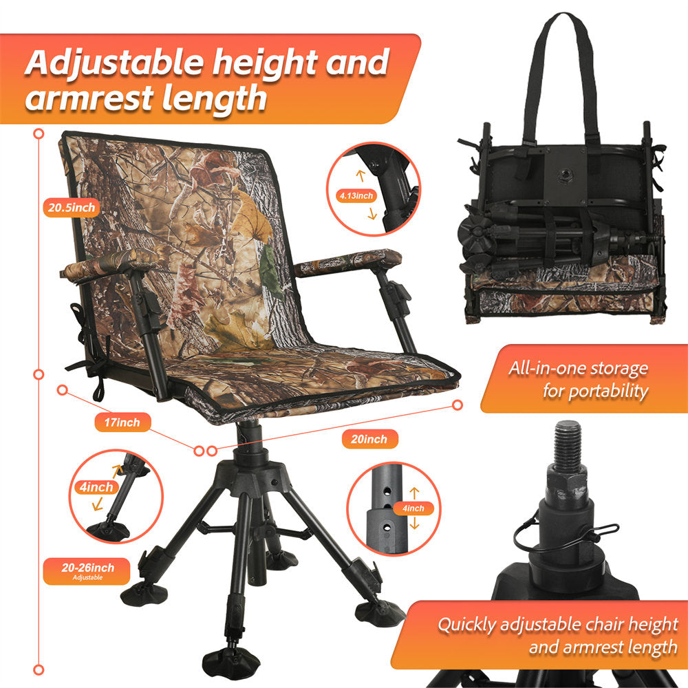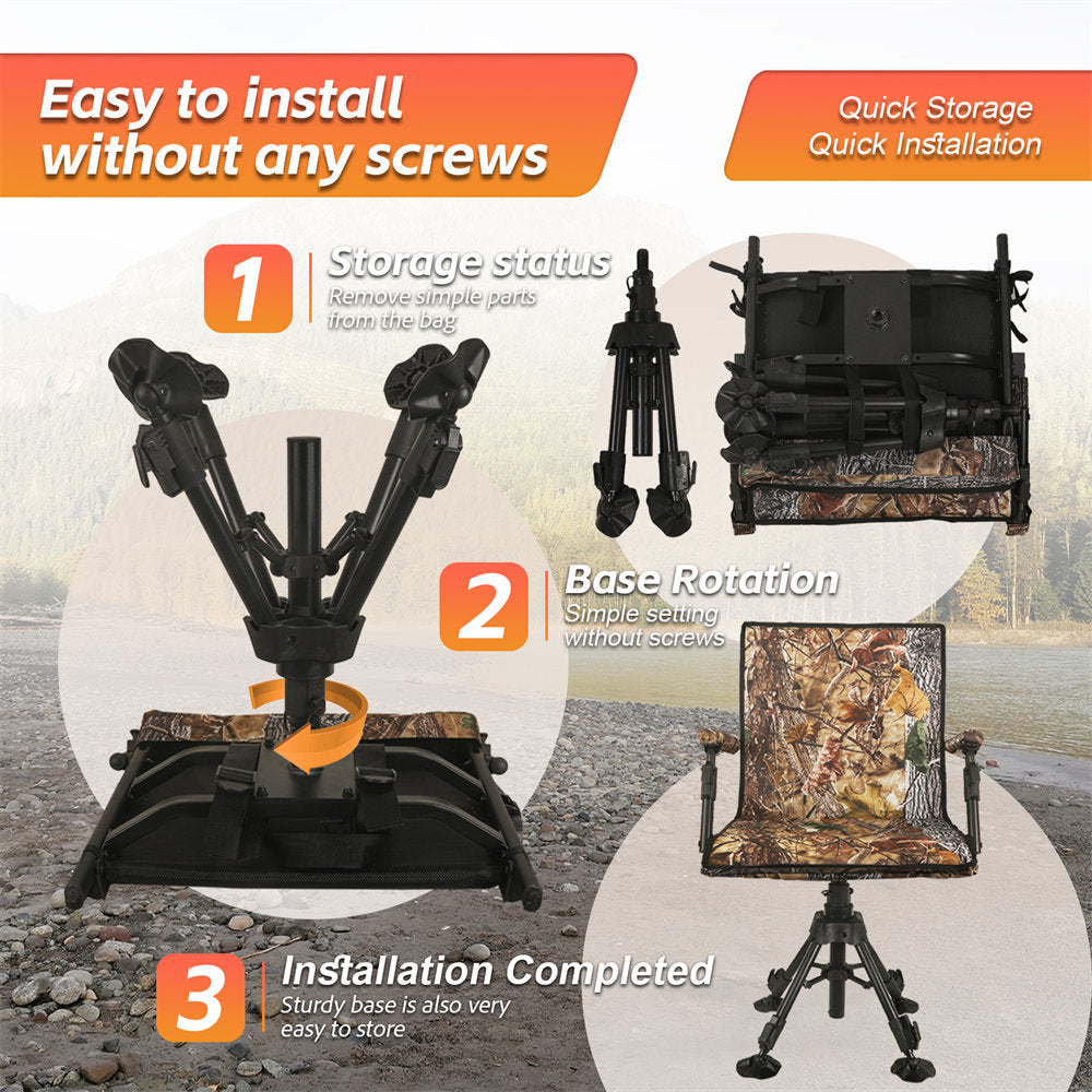 Designed for convenience, the chair offers quick, tool-free assembly—legs lock in place with a simple twist, and the compact folding design makes transport effortless. Hunters can also enjoy customized comfort with adjustable legs, seat height, and armrests, making it easy to adapt to uneven ground or personal preference.